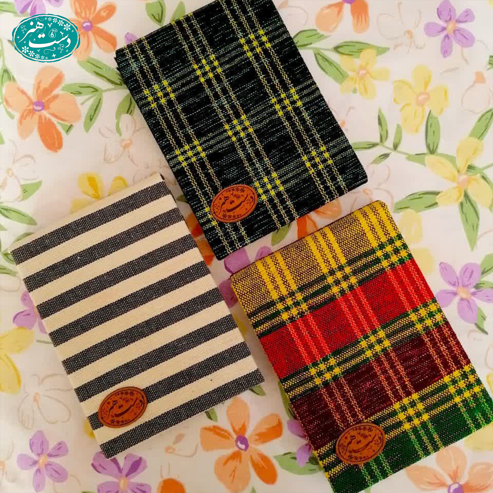 صحافی شده با پارچه دست بافت قابل سفارش در رنگ بندی و طرح دلخواه ابعاد: ۱۵×۱۳